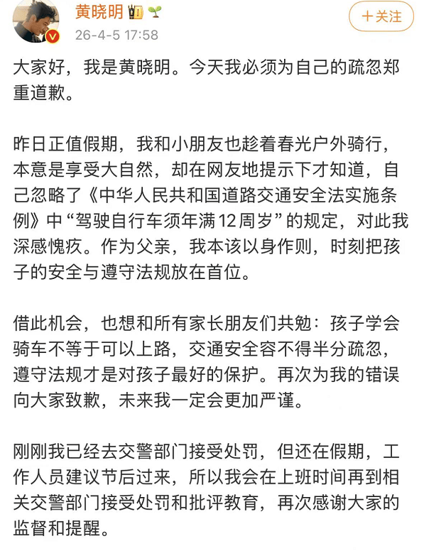 黄晓明带9岁儿子骑行被指违法本人道歉:忽略了“驾驶自行车须年满12周岁”的规定已去交警部门接受处罚乐鱼体育- 乐鱼体育官网- APP世界杯指定平台
