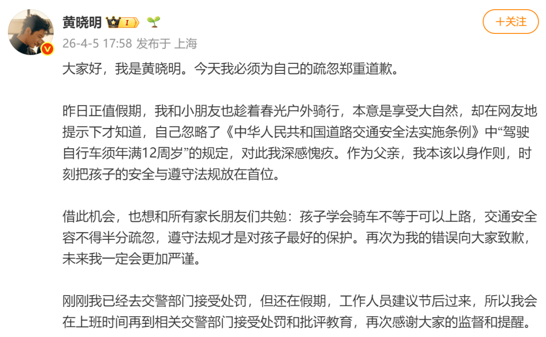 黄晓明就“带9岁儿子上路骑行”致歉:会到相关交警部门接受处罚和批评教育乐鱼体育- 乐鱼体育官网- APP世界杯指定平台