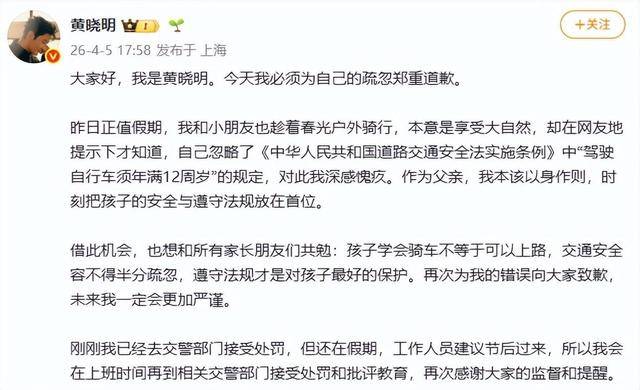 乐鱼体育,乐鱼体育官方网站,乐鱼体育靠谱吗,乐鱼体育app,乐鱼体育官网,乐鱼体育,乐鱼体育入口,乐鱼体育官方,乐鱼官网登录,乐鱼后台,乐鱼体育网址,乐鱼体育注册大家好,我是黄晓明。今天我必须为自己的疏忽郑重道歉。昨日正值假期,我和小朋友也趁着春光户外骑行,本意是享受大自然,却在网友地提示下才知道,自己忽略了《中华人民共和国道路交通安全法实施条例》中“驾驶自行车须年满12周岁”的规定,对此我深感愧疚。作为父亲,我本该以身作则,时刻把孩子的安全与遵守法规放在首位。借此机会,也想和所有家长朋友们共勉:孩子学会骑车不等于可以上路,交通安全容不得半分疏忽,遵守法规才是对孩子最好的保护。再次为我的错误向大家致歉,未来我一定会更加严谨。刚刚我已经去交警部门接受处罚,但还在假期,工作人员建议节后过来,所以我会在上班时间再到相关交警部门接受处罚和批评教育,再次感谢大家的监督和提醒。