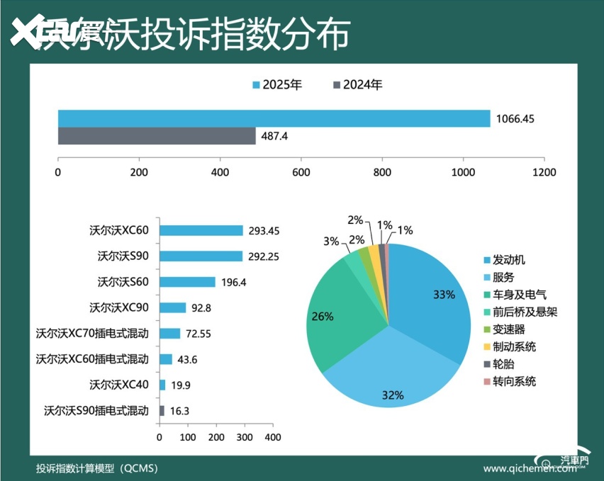 汽车质量投诉点评:2025年,沃尔沃的投诉指数为1066.45,同比上升118.8%。沃尔沃的典型投诉问题为发动机故障灯亮和不退订金。其中,发动机故障灯亮是投诉量最大的问题。沃尔沃XC60和沃尔沃S90是该问题的高发车型。部分沃尔沃车主反馈,沃尔沃官方将凸轮轴从进口原件改为国产部件,此举造成凸轮轴普遍存在质量问题,进而导致车辆发动机故障灯亮。对此,部分沃尔沃车主反映,沃尔沃官方和4S店以车辆超出质保期为理由,拒绝处理该问题。沃尔沃厂家回复称,企业已收到信息,正在尽快跟进。但至今沃尔沃官方也未给出合理的解决方案。
