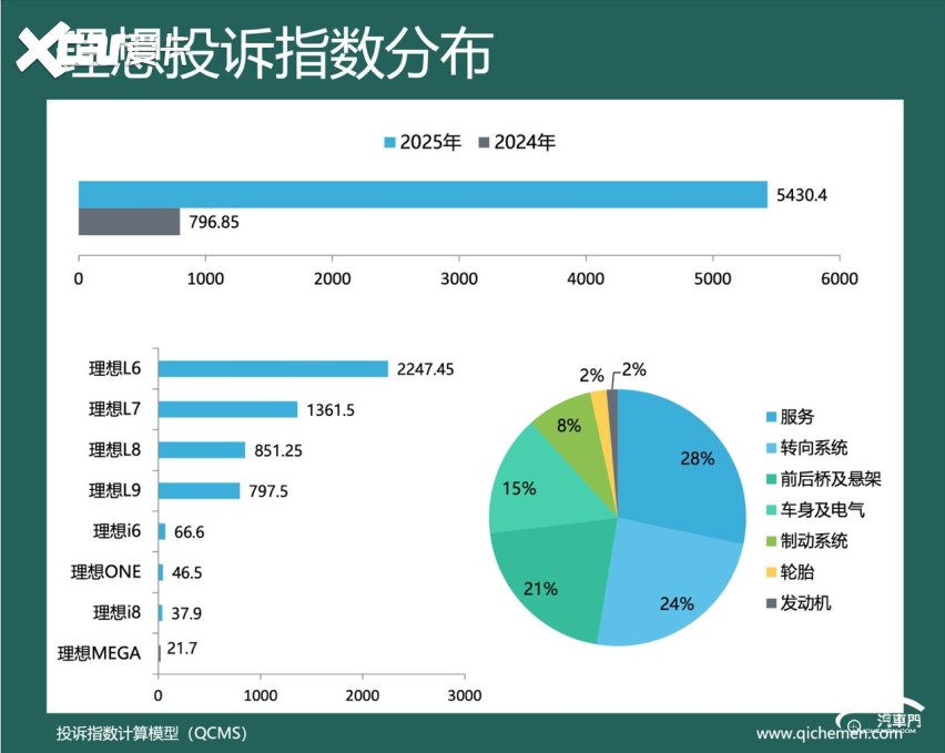 汽车质量投诉点评:去年,理想的投诉指数为2981.55,同比暴涨近六倍。与2024年相比,该品牌排名上升7位,登上榜单榜首。理想的短期大幅降价、下摆臂异响两大痼疾不仅没有得到解决,反而遭到了更大规模的集中投诉。其中,短期大幅降价问题集中出现在理想L6、理想L7和理想L8三款车型。去年2月28日,理想汽车官方突然宣布全系车型大幅降价,多款车型降价超万元。此后,理想汽车多次以“保险补贴”名义对多款车型进行变相降价。许多理想汽车车主称,理想汽车降价前不仅没有提前告知车主,至今也未给予老车主补偿。此外,下摆臂异响也是困扰许多理想汽车车主的老问题。