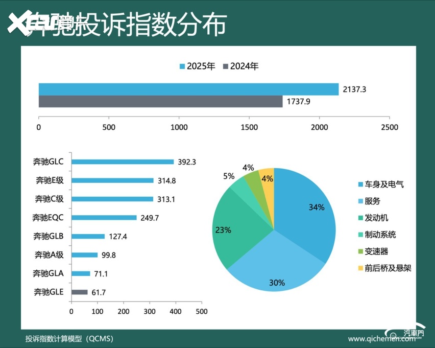 汽车质量投诉点评:去年,奔驰的投诉指数为2137.3,同比上升两成多,涨幅相对较小。召回升级后锁电问题遭到大量奔驰车主投诉。从投诉反馈来看,该问题集中出现在2020款至2022款奔驰EQC车型。去年12月,该问题投诉量猛增。据悉,去年奔驰对部分奔驰EQC车型进行召回。值得注意的是,正式召回前,奔驰官方特意强调,用户需将充电上限设定为不超过80%。然而,大量奔驰EQC车主反馈,车辆在召回后充电电压被限制。实际上,奔驰EQC车型现已停产,锁电问题或将难以得到妥善解决。