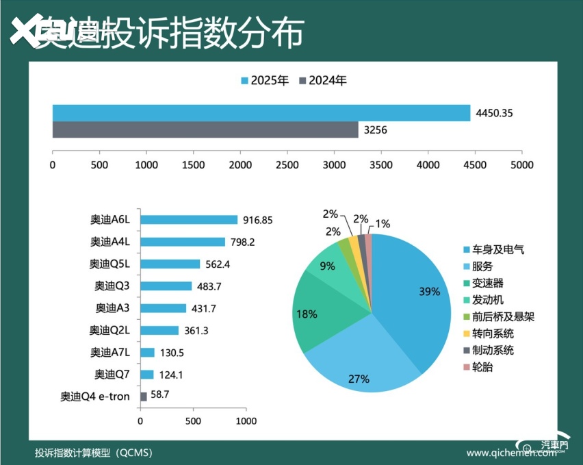 汽车质量投诉点评:2025年,奥迪的投诉指数为4450.35,同比上升36.68%。车身装饰脱落、变速箱机电单元故障和不退订金成为奥迪被集中投诉的主要原因。奥迪Q2L是车身装饰脱落问题频发的车型。大量该车车主投诉称,车辆在行驶过程中C柱饰板掉落,存在较大安全隐患。奥迪车主诉求奥迪厂家免费维修并加固相关部件。