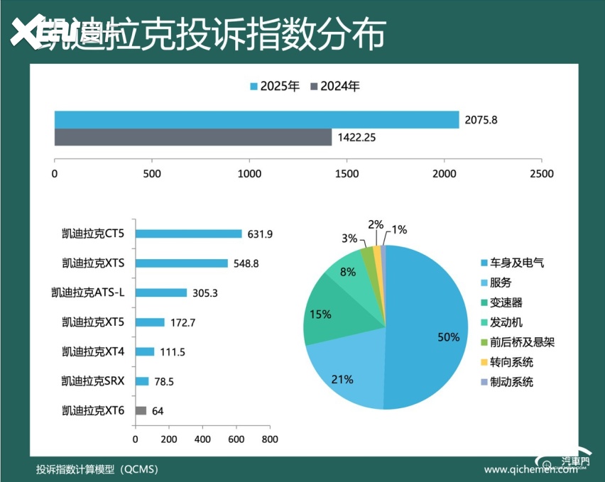 汽车质量投诉点评:2025年,凯迪拉克的投诉指数为2075.8,同比上涨45.95%。中控屏幕失灵开裂、变速箱阀体故障是凯迪拉克被集中投诉的主要问题。凯迪拉克CT5、凯迪拉克XTS、凯迪拉克ATS-L是车主投诉的主要车型。其中,许多凯迪拉克XTS和凯迪拉克ATS-L的老款车车主投诉称,车辆的中控屏幕出现触摸失灵和开裂的问题。部分凯迪拉克车主表示,厂家没有可供更换的对应配件。目前,车主们要求厂家更换故障屏幕。但凯迪拉克厂家回复称,车辆使用年限已超出整车质保期限,因此厂家不予处理。
